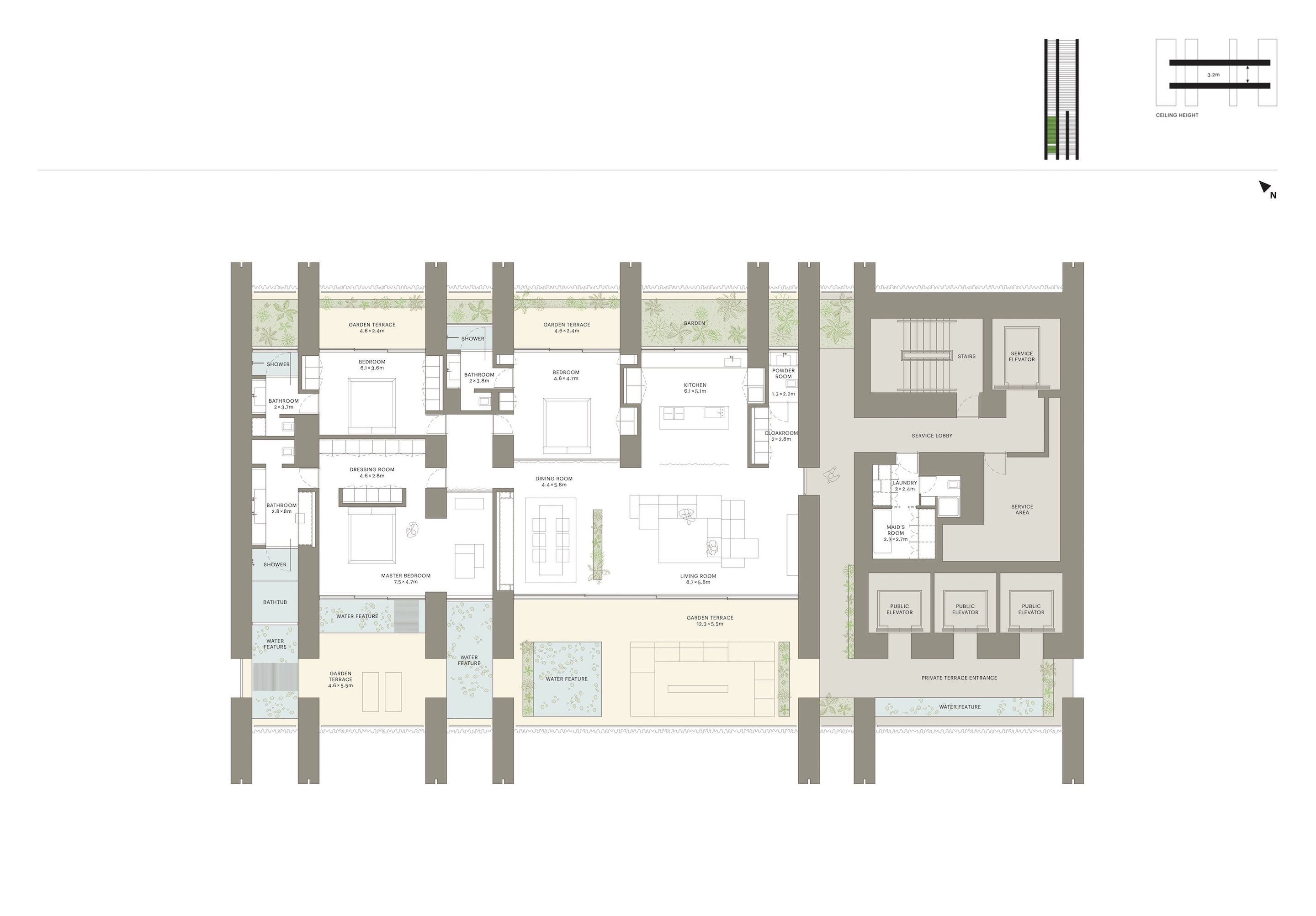 Diese großzügige 3-Bedroom-Residence definiert modernes Wohnen auf 459 m² mit maximaler Offenheit, Weitblick und architektonischer Eleganz. Der Grundriss ist auf Dual-Aspect ausgerichtet – mit Fensterfronten zu beiden Seiten und einer natürlichen Querlüftung, die das Raumklima zu jeder Tageszeit angenehm reguliert.Das Herzstück bildet der offene Wohn-/Essbereich mit maßgefertigter Küche, raumhohen Verglasungen und fließendem Übergang zur weitläufigen Terrasse. Auf über 190 m² Außenfläche entsteht ein einzigartiger Rückzugsraum mit Blickachsen über den Dubai Water Canal, die Skyline und bis zur Küstenlinie.