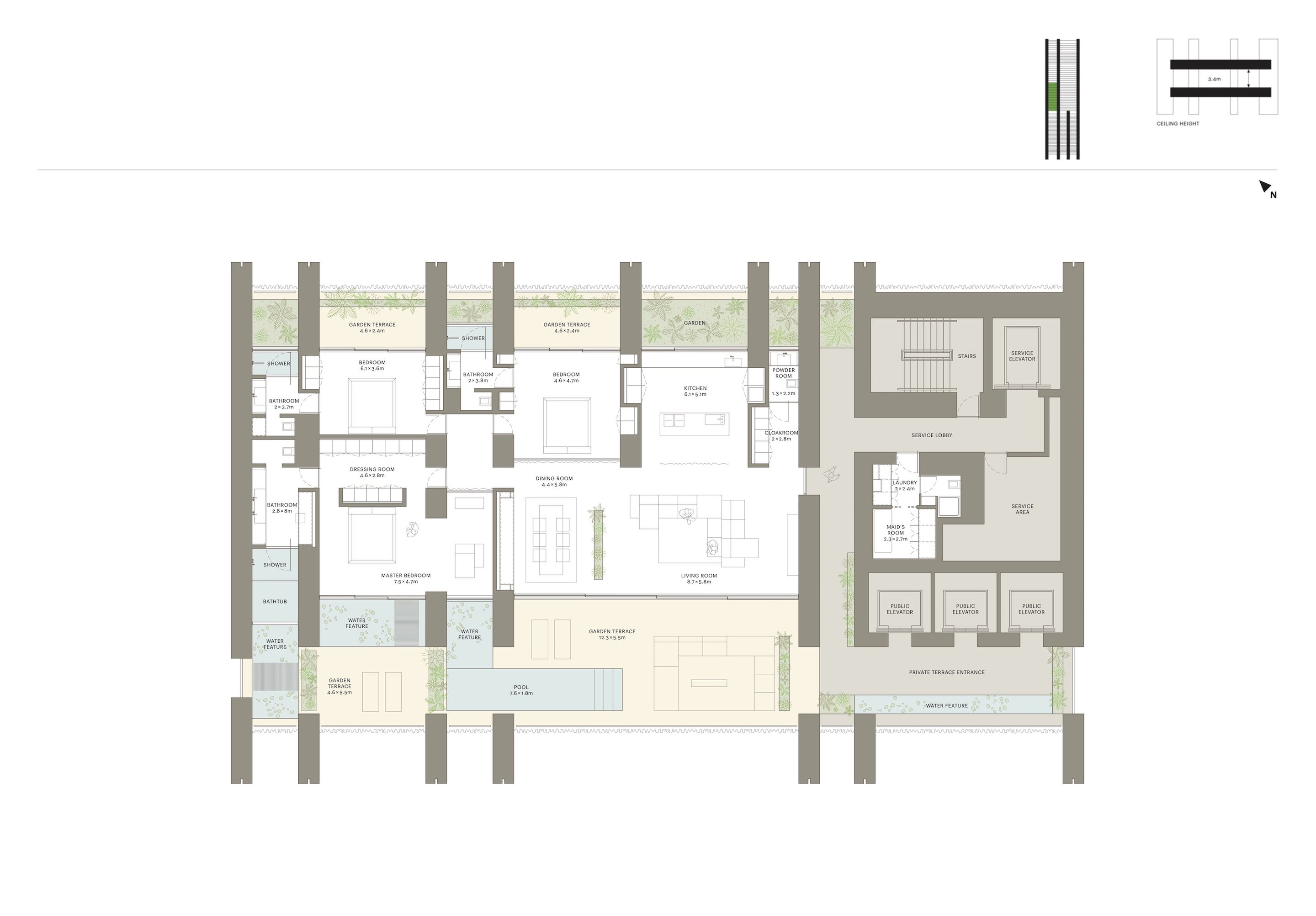 Die 3-Bedroom Pool Residence gehört zu den exklusivsten Einheiten innerhalb von Muraba Veil. Mit einer Gesamtfläche von 459 m², einem privaten Swimming Pool und weitläufigen Terrassen eröffnet sich hier das Gefühl einer Villa – nur mit dem Horizont als Nachbarn.Die Residenz liegt in den oberen Etagen (33–49) und ist durchgängig dual-aspekt konzipiert: Licht, Luft und Weite fließen durch den offenen Grundriss, der Innen- und Außenräume auf elegante Weise verbindet.