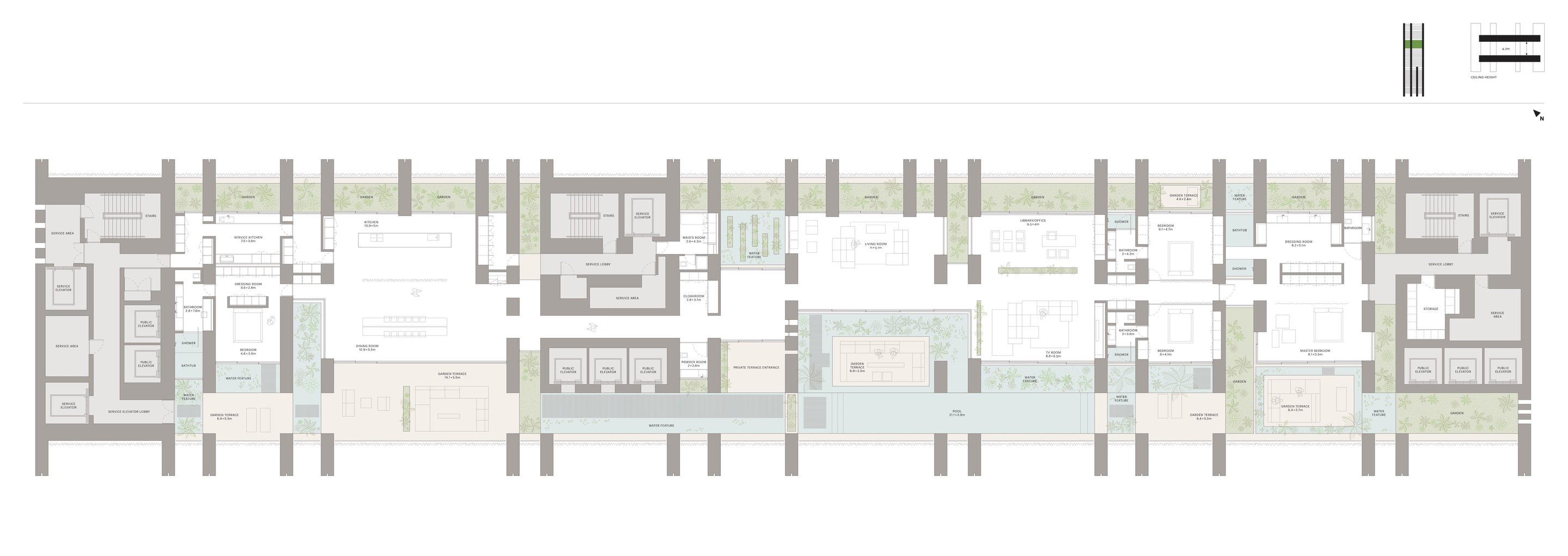 Die großzügige, offene Grundrissgestaltung verbindet vier Schlafzimmer (alle en suite) mit weitläufigen Wohnbereichen, Designküche, Bibliothek, optionalem Gym oder Office sowie Servicezonen. Der Außenbereich – fast 730 m² groß – umfasst Sonnendecks, Lounge-Zonen, Dining-Flächen und den markanten Infinity-Pool, der sich entlang der Skyline erstreckt.